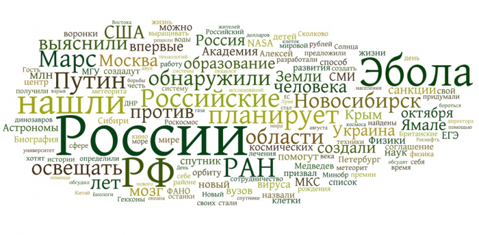 Если вы очень внимательны и очень догадливы, то вы посмотрите на предыдущее облако еще раз и скажете: погодите, но почему вы выбрали как ключевые слова «наука / научный»? Ведь в новости или аналитической статье про научное открытие скорее всего не будут писать слово «наука». Вы будете абсолютно правы. Мы догадались об этом чуть позже, и начали смотреть повестку по словам «наука / научный / ученые». Картинка стала выглядеть несколько более валидно: